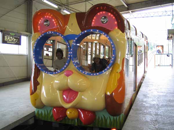 で、車両に乗り込んでみると、中には「間違い探し」なんて手作りのイラストが貼ってあるし、動き出したら歌が流れるんですけれど、これが「猫踏んじゃった」のメロディーだったり…もう、kanaの笑いのツボにはまってしまって、kanaは笑い続けておりますよ。 いや〜〜、関西のノリって言うんでしょうかネ〜♪