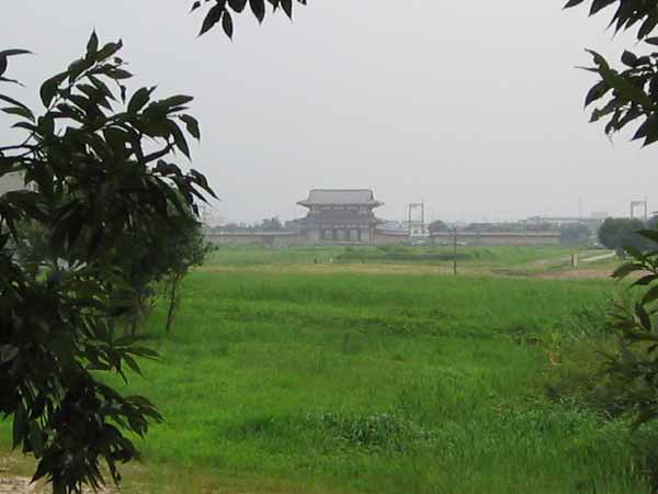 さて、どんどん歩いていくと↓こんどは、復元された奈良時代の門でしょうか。このあたりが皇居があったあたりなんですが、不思議なことに平城京の跡地は、畑というか、草原なんですよね。京都は営々と市民生活が営まれているのに比べると、何とも不思議です。
